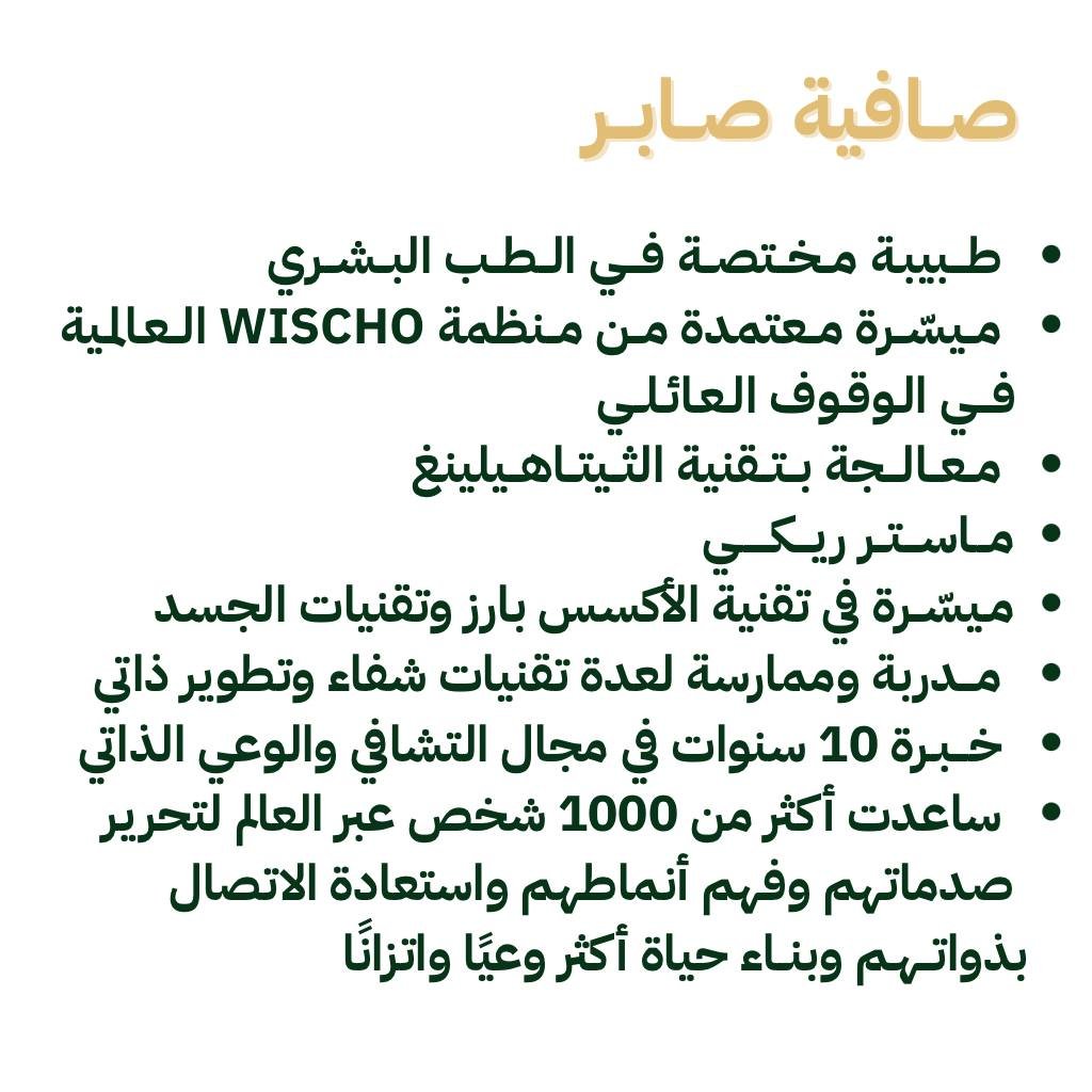 لم أختر أن أكون هنا لأجيب عن الأسئلة بسطحية، بل لأقف معك أمام المرايا الخفية التي لم تجرؤ يومًا أن تنظر إليها. أنا هنا لأفتح لك الأبواب التي تقودك نحو قلبك، نحو حقيقتك نحو الأمان الذي لا يسلبه أحد منك. في رحلتي رافقت أرواحًا تحمل ندوب الطفولة رجالًا ونساءً عاشوا في صمت ألمهم، يظنون أن الحياة هي تكرار لجروح الماضي. لكنني رأيت فيهم دومًا ما لم يروه هم: شعاع نور يبحث عن ممر نداء داخلي يهمس: لقد آن الأوان عملتُ مع من أرهقهم الخوف من الرفض، من الهجر، من الفقد مع من حملوا ثقل أجيال قبلهم في نظامهم العائلي دون وعي، حتى صاروا يختنقون من عبء ليس لهم ورأيت كيف يمكن للحظة وعي صادقة أن تُحرّر كيف يمكن لقرار صغير أن يفتح مجالًا واسعًا للحياة عملي مخصص لكل من يقف على الحافة بين البقاء أسيرًا للألم، أو اتخاذ خطوة نحو النور. لكل من يقول: كفى ، لم أعد أريد أن أكرر لم أعد أريد أن أخاف أريد أن أتحرر أريد أن أرتقي أريد أن أعود إلى نفسي إلى النور أنا هنا لأرافقك في رحلتك نحو الشفاء لا كمرشدة تسبقك، بل كرفيقة تسير معك نحو النور.